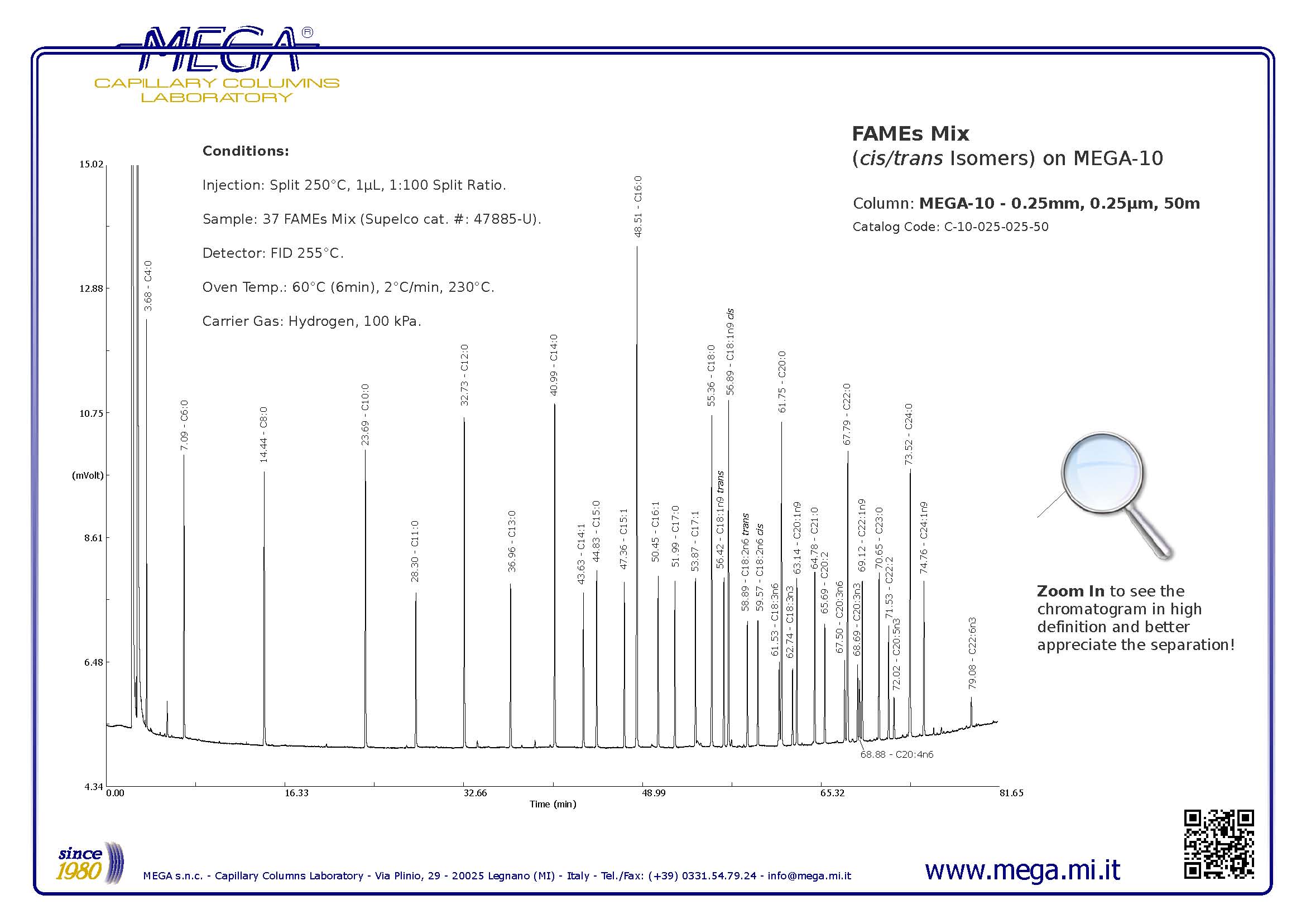 意大利MEGA公司(中文“美佳”)具有30多年專業(yè)生產(chǎn)和研發(fā)氣相色譜石英毛細(xì)柱的企業(yè),其產(chǎn)品之一MEGA-10毛細(xì)管柱可以滿足此標(biāo)準(zhǔn)的要求,規(guī)格:50m x 0.25mm 0.20um df,可以很好分離標(biāo)準(zhǔn)中規(guī)定的37種脂肪酸。與使用其它品牌100m x 0.25mm 0.20um df色譜柱相比,優(yōu)越性在于: