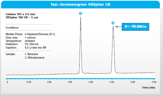 2、CN液相色譜填料性能-高柱效:119,000/m,當(dāng)今常規(guī)正相液相色譜柱最高柱效的代表。