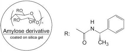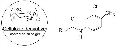 纖維素型是使用最廣泛的手性柱之一,纖維素型手性色譜柱的分離作用包括相互吸引的作用及形成包埋復(fù)合物。它們屬于Wainer分類中的第2種類型。市售的手性色譜柱為微晶三醋酸基、三安息香酸基、三苯基氨基酸鹽纖維素固定相。很多化合物可通過(guò)此類型的色譜柱得到分離。這種類型的手性色譜柱種類也很齊全。流動(dòng)相使用低極性溶劑,典型的流動(dòng)相為異丙醇-正己烷混合物。這類柱子根據(jù)制作工藝,分為涂敷與鍵合兩大類。但特別要注意由于氯可以使涂敷纖維素從硅膠上脫落,因此要確保涂敷類柱子流動(dòng)相中無(wú)含氯溶劑。