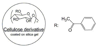纖維素型是使用最廣泛的手性柱之一,纖維素型手性色譜柱的分離作用包括相互吸引的作用及形成包埋復(fù)合物。它們屬于Wainer分類中的第2種類型。市售的手性色譜柱為微晶三醋酸基、三安息香酸基、三苯基氨基酸鹽纖維素固定相。很多化合物可通過此類型的色譜柱得到分離。這種類型的手性色譜柱種類也很齊全。流動(dòng)相使用低極性溶劑,典型的流動(dòng)相為異丙醇-正己烷混合物。這類柱子根據(jù)制作工藝,分為涂敷與鍵合兩大類。但特別要注意由于氯可以使涂敷纖維素從硅膠上脫落,因此要確保涂敷類柱子流動(dòng)相中無含氯溶劑。