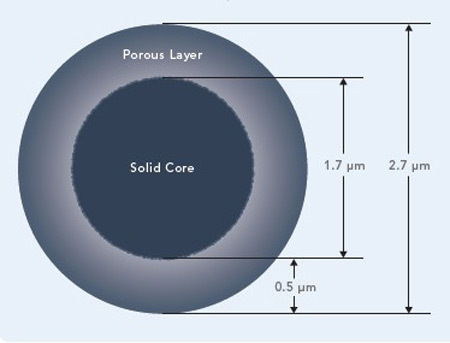 核殼顆粒是由著名色譜科學(xué)家 Jack Kirkland 教授于2006年研制成功的?!昂藲ば汀碧盍献畛跏菫榱耸筓HPLC色譜柱比常規(guī)2μm填料UHPLC色譜柱更堅固可靠。Fused-Core(核殼或熔融) 技術(shù)就是將多孔硅殼熔融到實心的硅核上面而制備出的。這些多孔的“光環(huán)”狀顆粒具有極小的粒徑分布和擴散路徑,可以同時減小軸向和縱向擴散,減小峰寬,提高柱效。核殼技術(shù)被證明非常有效,因此衍生了多種不同的品牌和固定相類別,成了HPLC和UHPLC中有力的色譜工具。